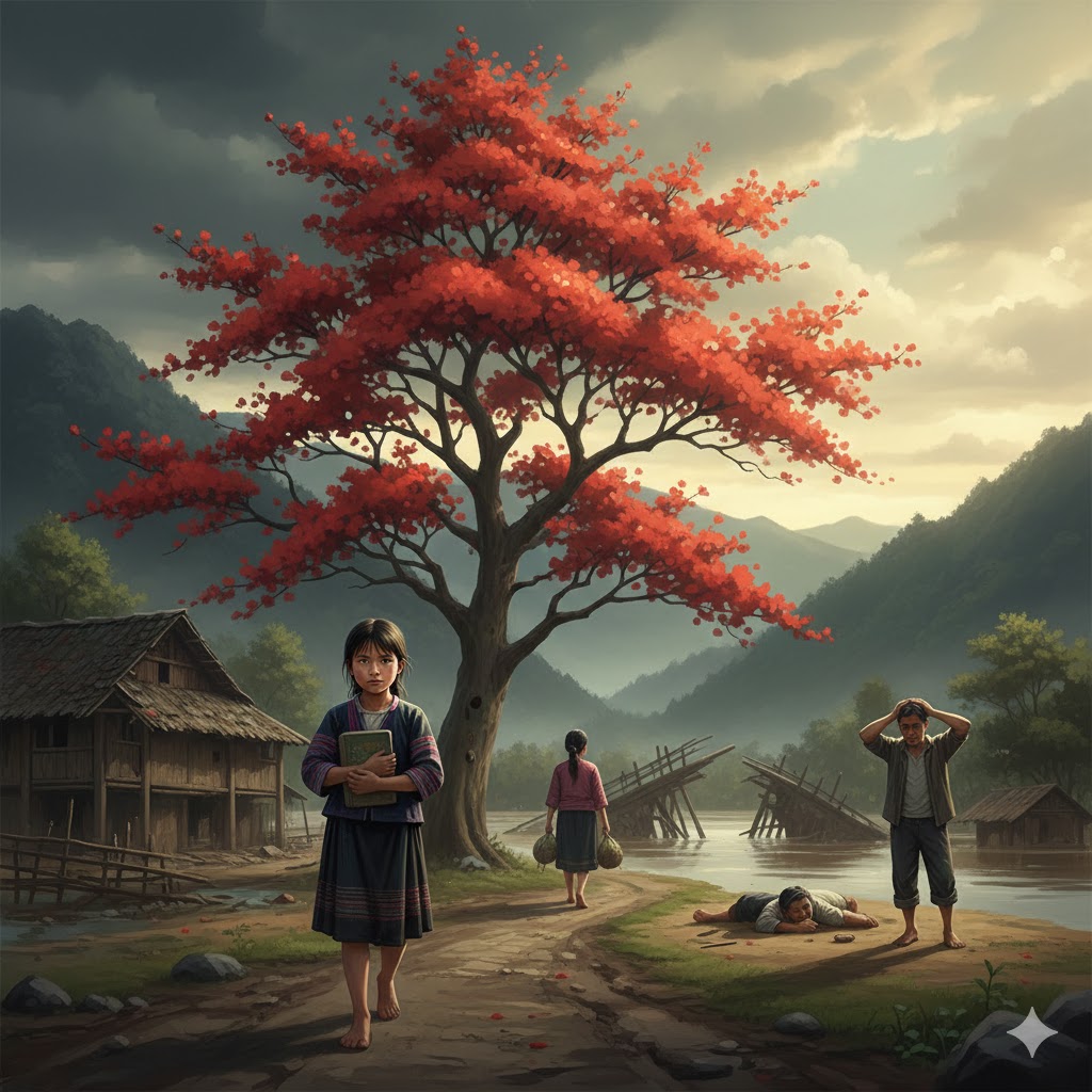Rồi cô lại chạy về phía cuối bản nơi lán học. Dưới gốc cây gạo già, thầy giáo đang đứng đó, mặt lem luốc bùn lẩy, anh nhìn cô khẽ mỉm cười. Nắng sau mưa rơi xuống, rực rỡ. Nụ cười anh sáng lấp lánh như mặt trời vừa nhô khỏi đỉnh núi. Hoa gạo nở đỏ rực trên cao, màu hoa không còn gắt như máu mà ấm lên màu than hồng, như cháy lên giữa nền trời sau mưa, như những đốm lửa giữ lại sự sống cho bản làng vừa đi qua bão lũ.
