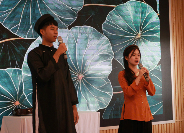 “Lời ru đất mẹ” khai thác hình ảnh lời ru như một sợi dây kết nối giữa các thế hệ. Không cần kịch tính, tiết mục chạm đến người xem bằng chính sự giản dị và chân thật, gợi nhắc về tuổi thơ, gia đình và những giá trị bền vững. Trong khi đó, “Đêm uyên ương” đã sân khấu hóa Truyện Kiều bằng âm nhạc và diễn xướng dân gian. Những làn điệu truyền thống kết hợp với ngôn ngữ sân khấu giúp câu chuyện Kim – Kiều trở nên gần gũi, sống động hơn với học sinh hôm nay. Điểm đáng ghi nhận là học sinh không chỉ tái hiện mà còn sáng tạo trên nền tảng truyền thống, cho thấy khả năng tiếp biến văn hóa – một năng lực quan trọng trong giáo dục hiện đại.