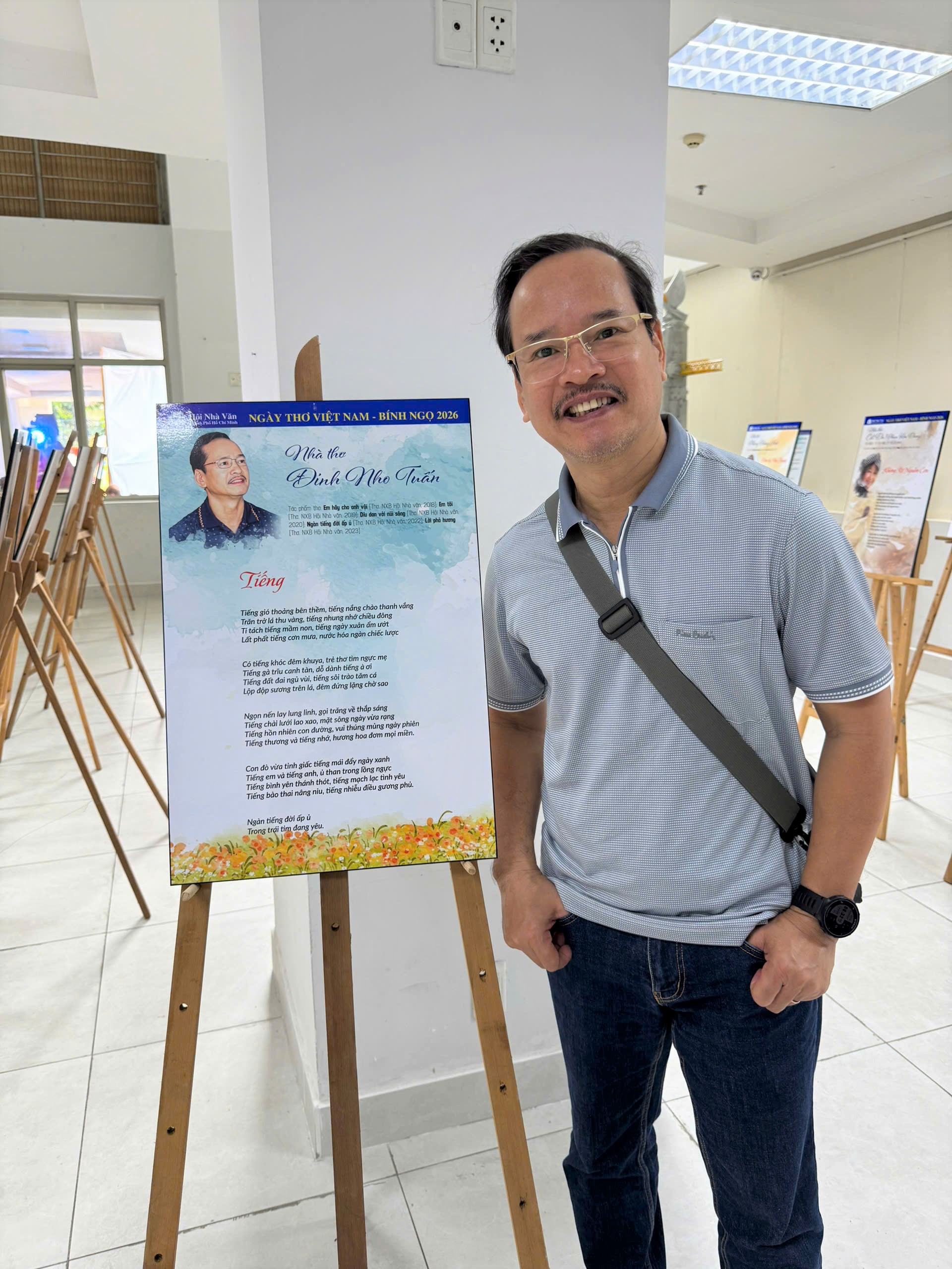 Nhà thơ Đinh Nho Tuấn bên poster thơ tại Ngày thơ Việt Nam 2026.
