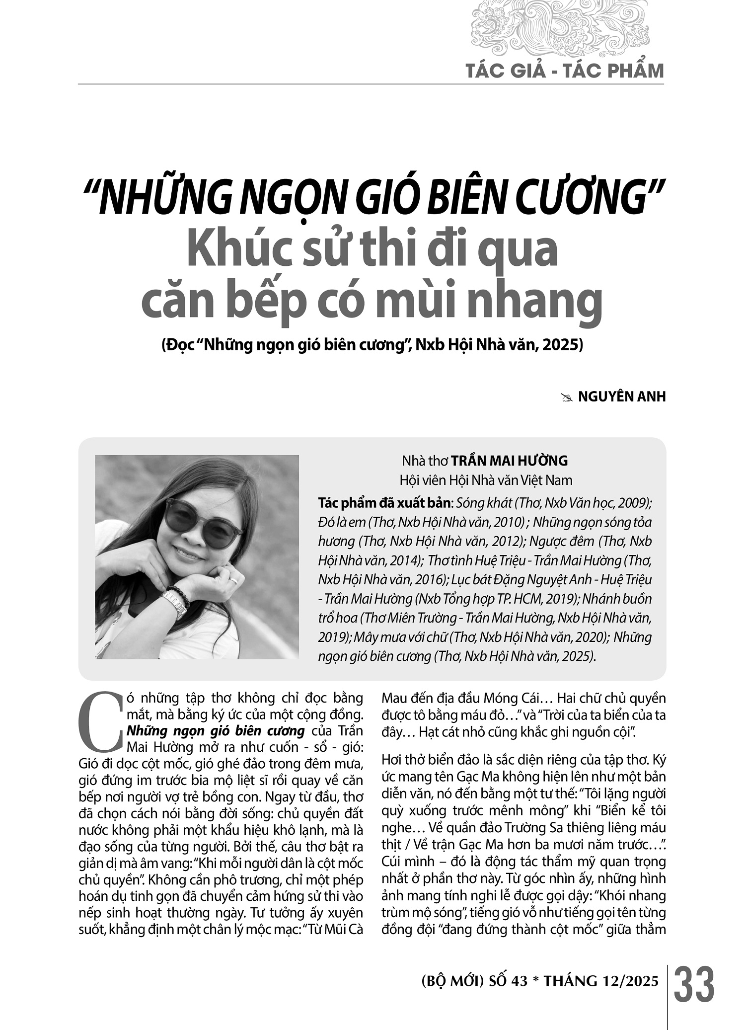 Biên cương trong tập thơ "Những ngọn gió biên cương" của Trần Mai Hường không chỉ là đường biên địa lý, mà còn là không gian của ký ức, tình người và mùi nhang khói gia đình. Một khúc sử thi nhỏ được kể bằng giọng thơ dịu lắng, nhắc ta yêu đất nước từ những điều gần nhất. Văn chương TP. Hồ Chí Minh trân trọng giới thiệu bài viết của Nguyên Anh, đăng trên Tạp chí Diễn đàn Văn nghệ Việt Nam, số 12/2025.