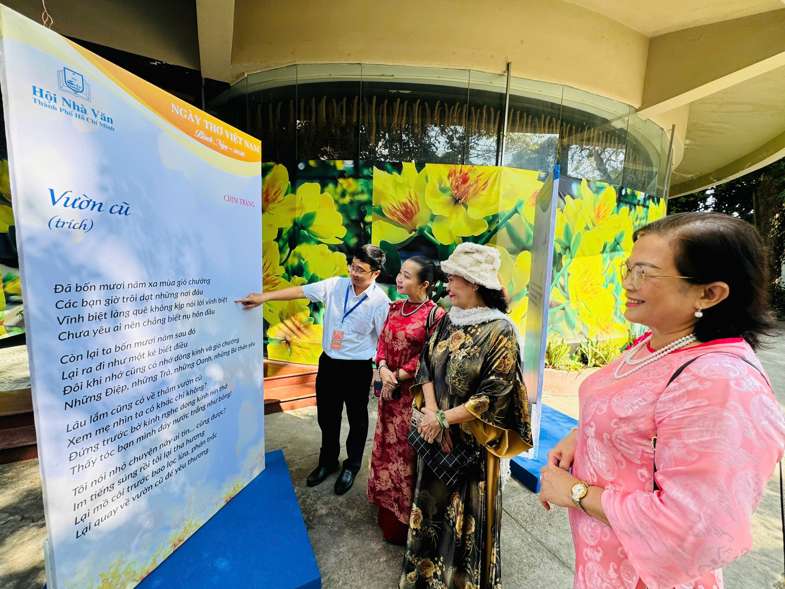 Nhà thơ Lê Thiếu Nhơn cùng các nhà thơ nữ tham quan Đường thơ. Ảnh: QUỲNH TRÂN