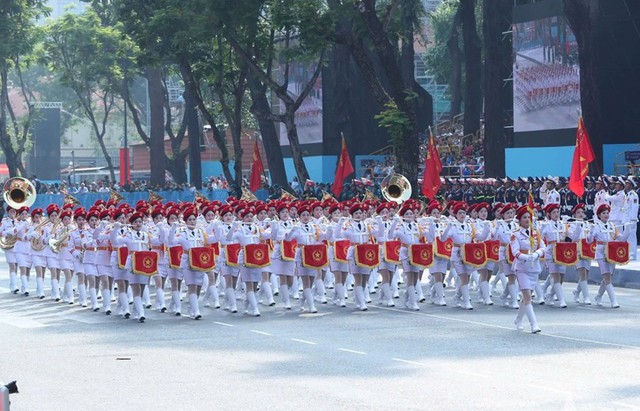Đi đầu đội hình diễu binh, diễu hành là Quốc huy nước Cộng hòa xã hội chủ nghĩa Việt Nam.