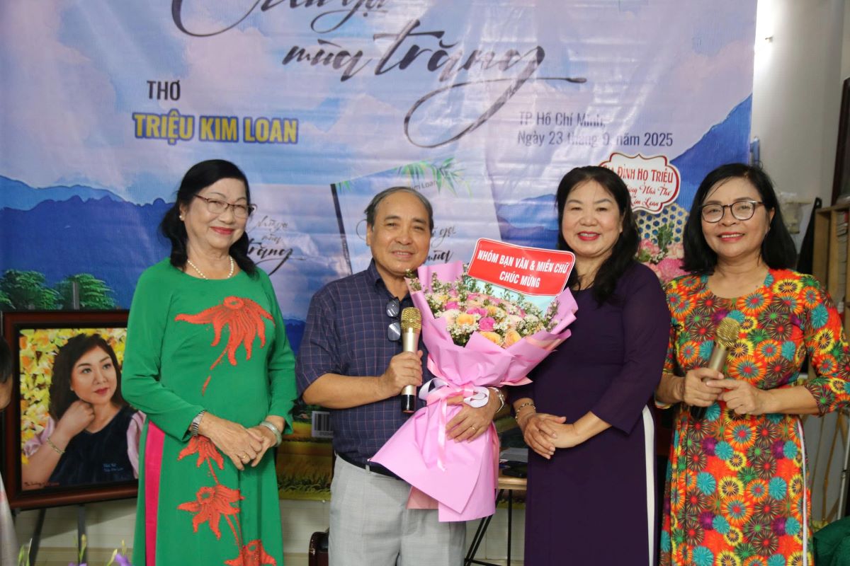 Nhóm "Bạn văn & Miền chữ" tặng hoa nhà thơ Triệu Kim Loan.