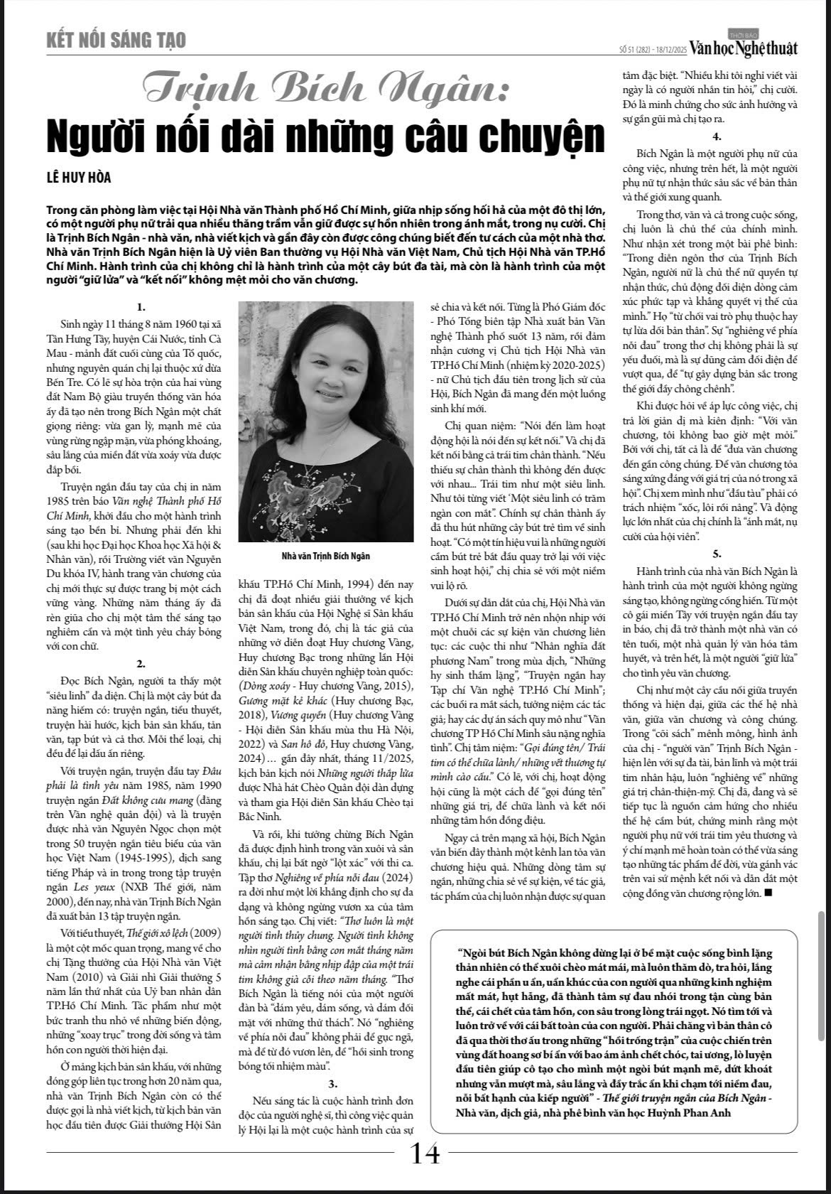 Trong căn phòng làm việc tại Hội Nhà văn Thành phố Hồ Chí Minh, giữa nhịp sống hối hả của một đô thị lớn, có một người phụ nữ trải qua nhiều thăng trầm vẫn giữ được sự hồn nhiên trong ánh mắt, trong nụ cười. Chị là Trịnh Bích Ngân - nhà văn, nhà viết kịch và gần đây còn được công chúng biết đến từ cương vị nhà thơ. Nhà văn Trịnh Bích Ngân hiện là Ủy viên Ban thường vụ Hội Nhà văn Việt Nam, Chủ tịch Hội Nhà văn TP.Hồ Chí Minh. Hành trình của chị không chỉ là hành trình của một cây bút đa tài, mà còn là hành trình của một người “giữ lửa” và “kết nối” không mệt mỏi cho văn chương.
