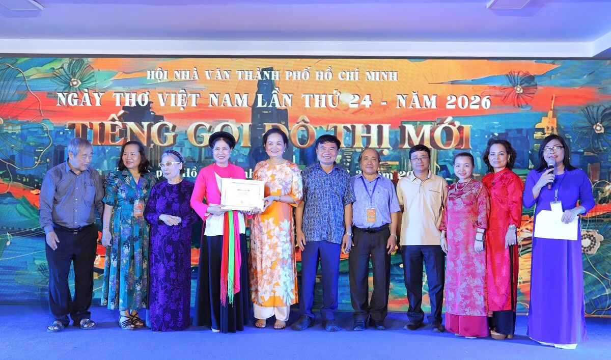 Nhà văn Trịnh Bích Ngân cùng BTC trao giải Nhất cho CLB Thơ ca Nam Định, một điểm sáng trong khối CLB tham gia Ngày thơ Việt Nam 2026 tại TP. Hồ Chí Minh.