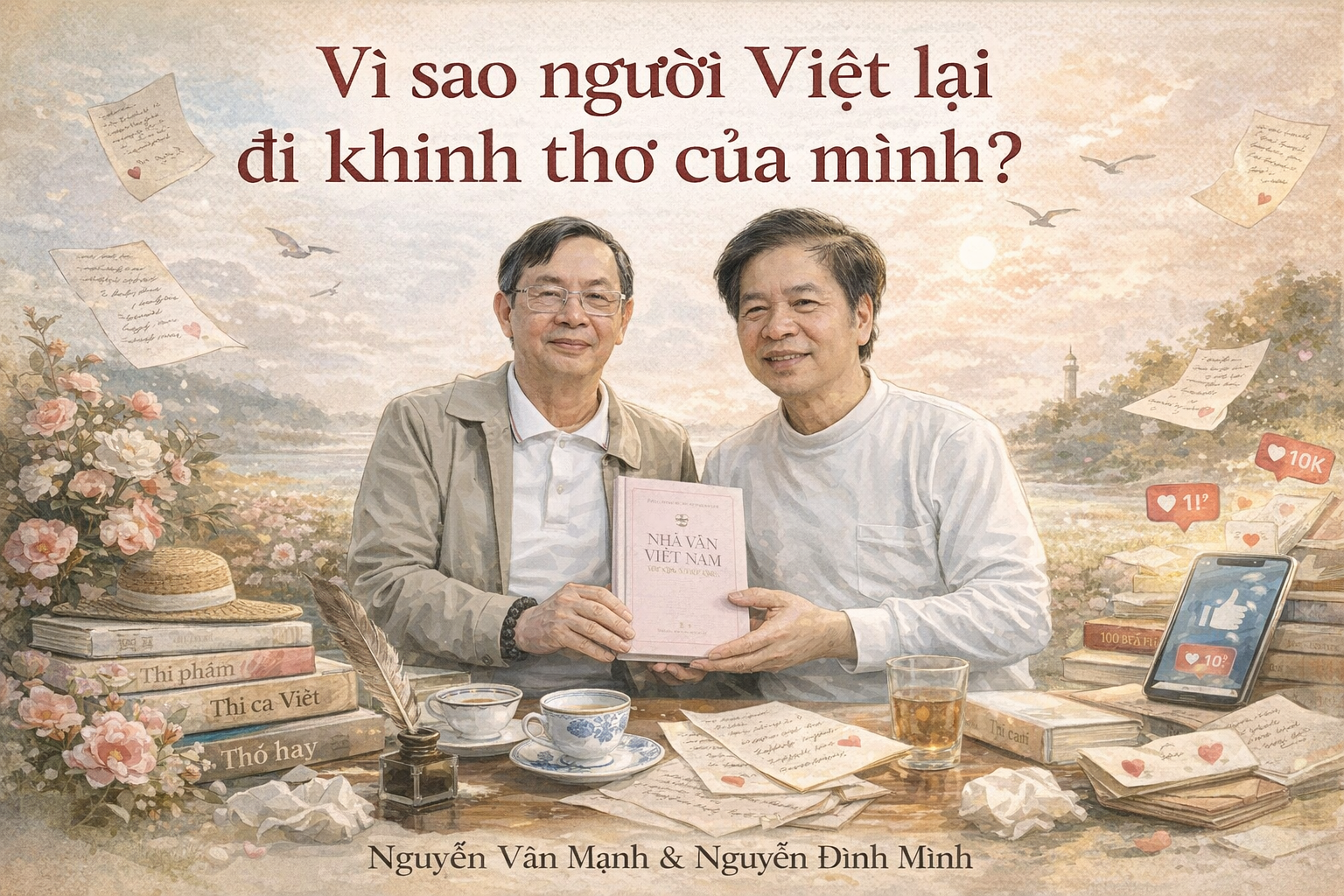 Từ một cuộc đối thoại hóm hỉnh nhưng không kém phần thẳng thắn, bài phỏng vấn của Nguyễn Văn Mạnh - Nguyễn Đình Minh đặt ra một câu hỏi khiến nhiều người làm thơ phải giật mình: Vì sao người Việt lại đi khinh thơ của mình? Từ câu chuyện “lạm phát thi sĩ”, sự bùng nổ thơ trên mạng xã hội đến nỗi lo về thơ AI và sự xuống cấp của văn hóa đọc, bài viết gợi mở nhiều suy nghĩ về “phẩm giá của thơ” trong đời sống hôm nay. Dẫu vậy, ẩn sau những nhận xét đôi khi châm biếm, tác giả vẫn gửi gắm một niềm tin rằng thơ – với tư cách là tiếng nói của tâm hồn – sẽ luôn tìm được con đường để tồn tại và trở lại vị trí xứng đáng trong đời sống tinh thần của con người. Văn chương TP. HCM xin giới thiệu bài phỏng vấn thú vị này.