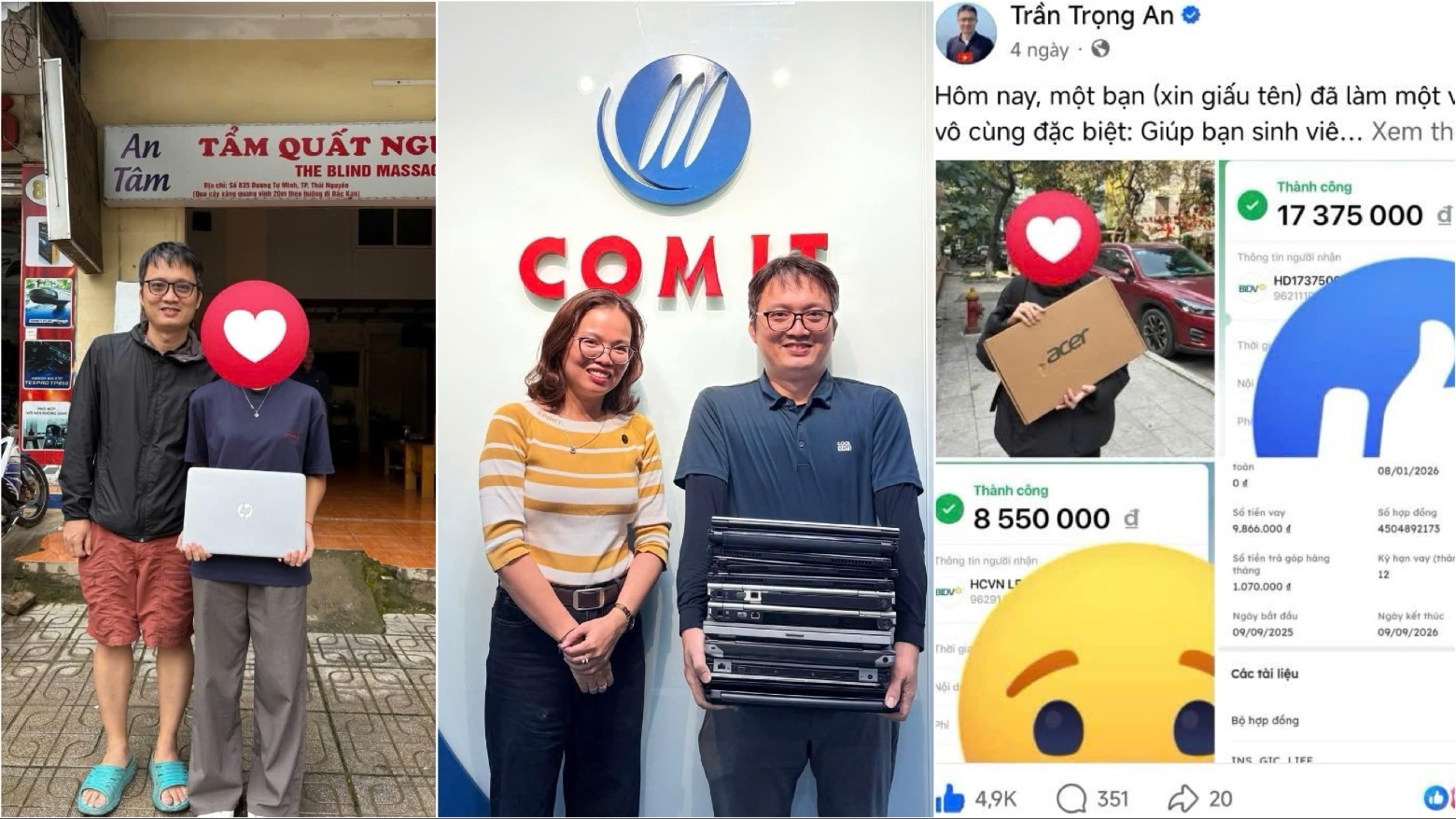 Gần đây, An viết là một người giấu tên đã làm một việc “vô cùng đặc biệt” vào ngày 25/12/ 25 đã đóng giúp cho SV nhận Laptop số 301 khoản nợ học phí của trường là 17.375 tr và trả nợ vay qua app là 8.55 tr để đóng học phí kì trước. Chứng thực cho bài viết là hình ảnh con số TK nhận tiền của trường và của App.