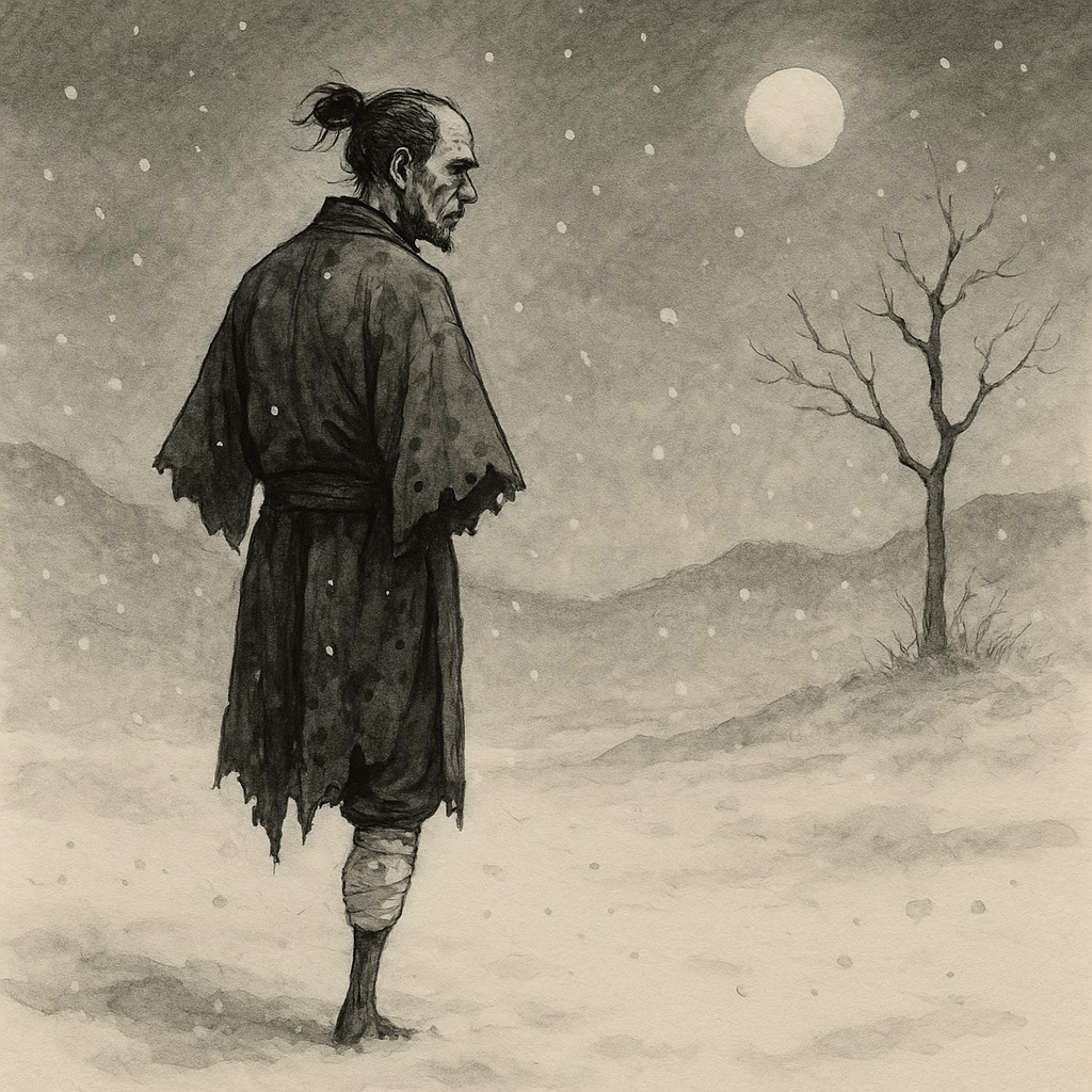Thanh kiếm của vị Samurai đọng tuyết, mơ hồ là dải khăn tang cho kẻ sắp bị chặt đầu, đã không còn tuyết đọng. Thanh kiếm đang cắm trong tuyết, một bàn tay vẫn đang nắm chặt chuôi. Đúng ra là cả cánh tay, máu đã hồng tuyết. Ngài Samurai đang quỳ, đầu ngửa ra sau, cổ họng đứt ngang hai phần ba.