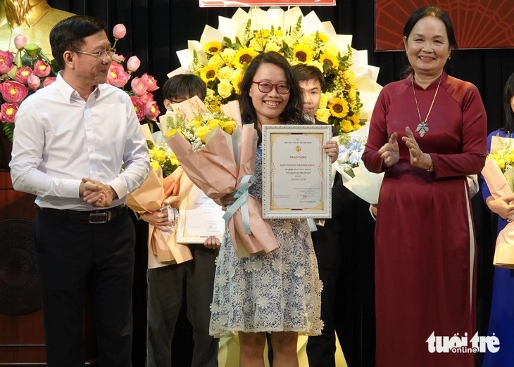 Phó giám đốc Sở Văn hóa và Thể thao TP.HCM Nguyễn Ngọc Hồi (trái) và Chủ tịch Hội Nhà văn TP.HCM Trịnh Bích Ngân trao giải thưởng Văn học dịch cho dịch giả Hương Châu - Ảnh: LINH ĐOAN