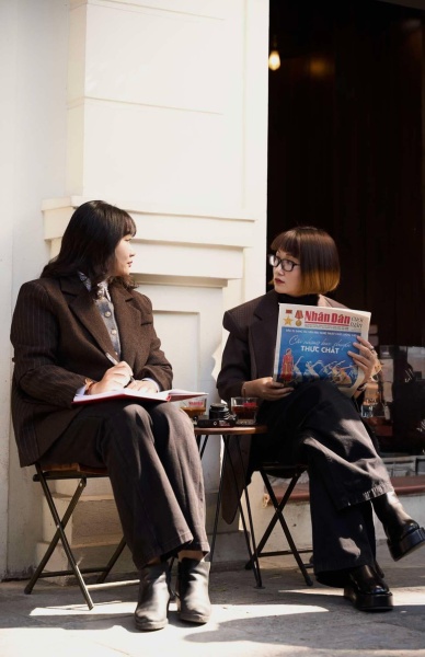 Trong câu chuyện cùng Nhân Dân cuối tuần, Mai Trịnh (bên phải) vẫn còn vẹn nguyên xúc cảm về sự thách thức cũng như thăng hoa mà dự án sách Lookbook Quảng Bình Đông Xuân mang lại. Ảnh: Nguyễn Hòa