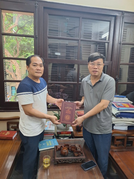 Đại tá - nhà văn Phùng Văn Khai (phải) tặng sách cho nhà thơ Lê Hưng Tiến