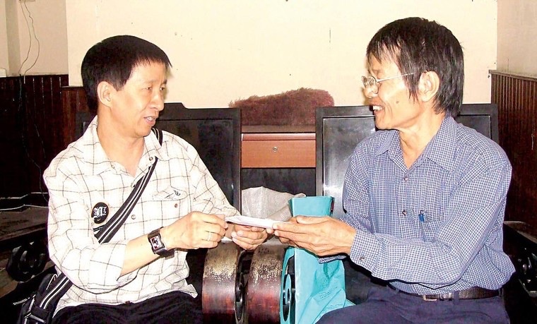 Nhà thơ Lâm Xuân Thi (trái) đang trao tiền giúp nhà thơ Hà Nguyên Dũng bị bệnh tim nặng - Ảnh: Hồ Thi Ca.