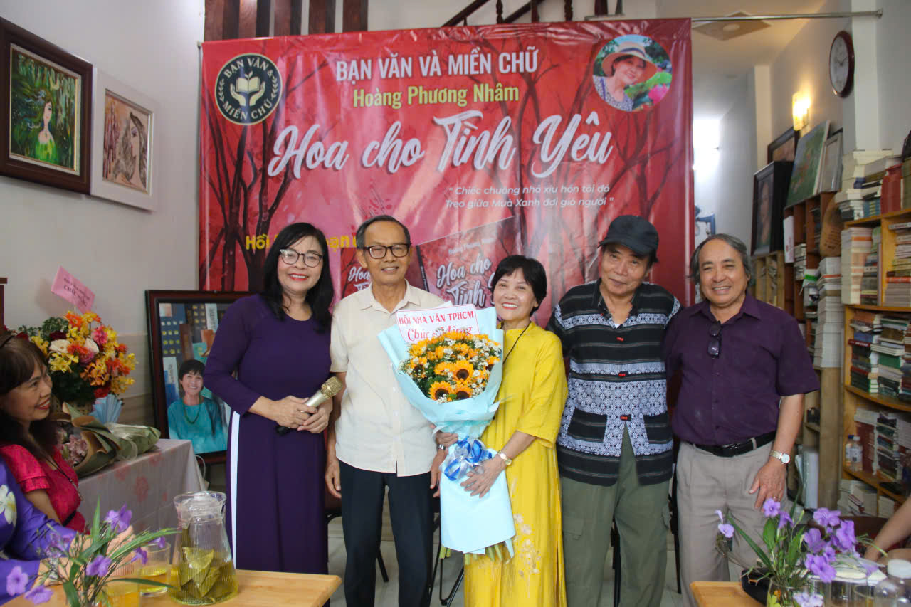 Sáng 10/9/2025, tại không gian Thư viện sách Trần Mai Hường, nhóm “Bạn văn & Miền chữ” đã có buổi sinh hoạt văn chương - nghệ thuật thứ hai kể từ ngày ra mắt. Lần đầu là Lễ trao tranh “Các văn nhân trong miền họa Thanh Hoàng”. Và chủ đề lần này xoay quanh tiểu thuyết "Hoa cho tình yêu" của nhà văn Hoàng Phương Nhâm – tác phẩm vừa đoạt giải khuyến khích cuộc thi sáng tác chủ đề “Thành phố Hồ Chí Minh – 50 năm tự hào bản anh hùng ca”.