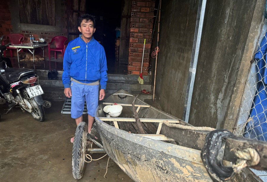 Anh Trần Công Thành bên chiếc ghe nhỏ đã cứu 40 người trong lũ dữ ở xã Hòa Thịnh, Đắk Lắk. (Ảnh: TT)