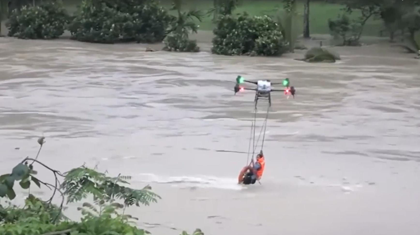 Hình ảnh drone thả dây cứu một người đàn ông bị mắc kẹt giữa dòng sông Sêrêpôk.