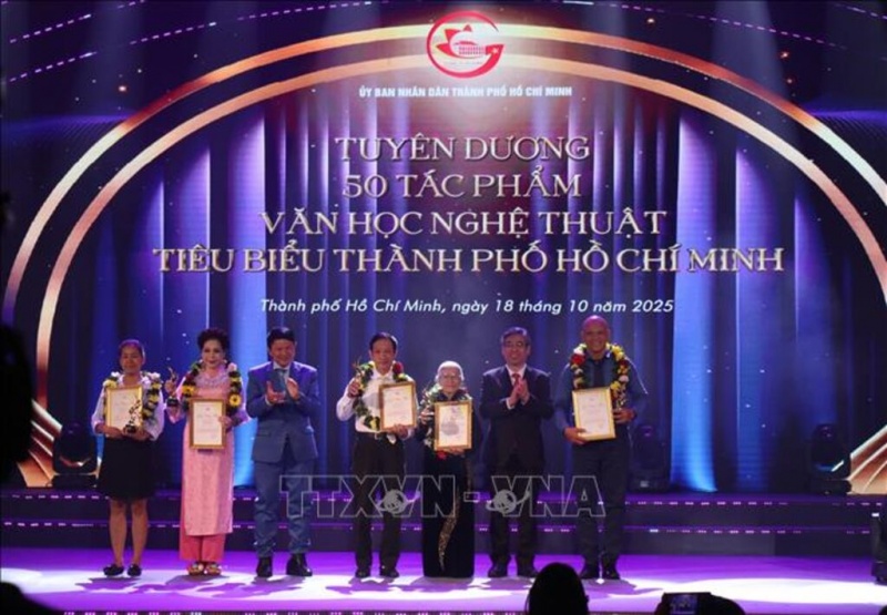 Ban Tổ chức tuyên dương các tác phẩm văn học, nghệ thuật tiêu biểu của Thành phố Hồ Chí Minh ở các lĩnh vực. Ảnh: Thu Hương - TTXVN