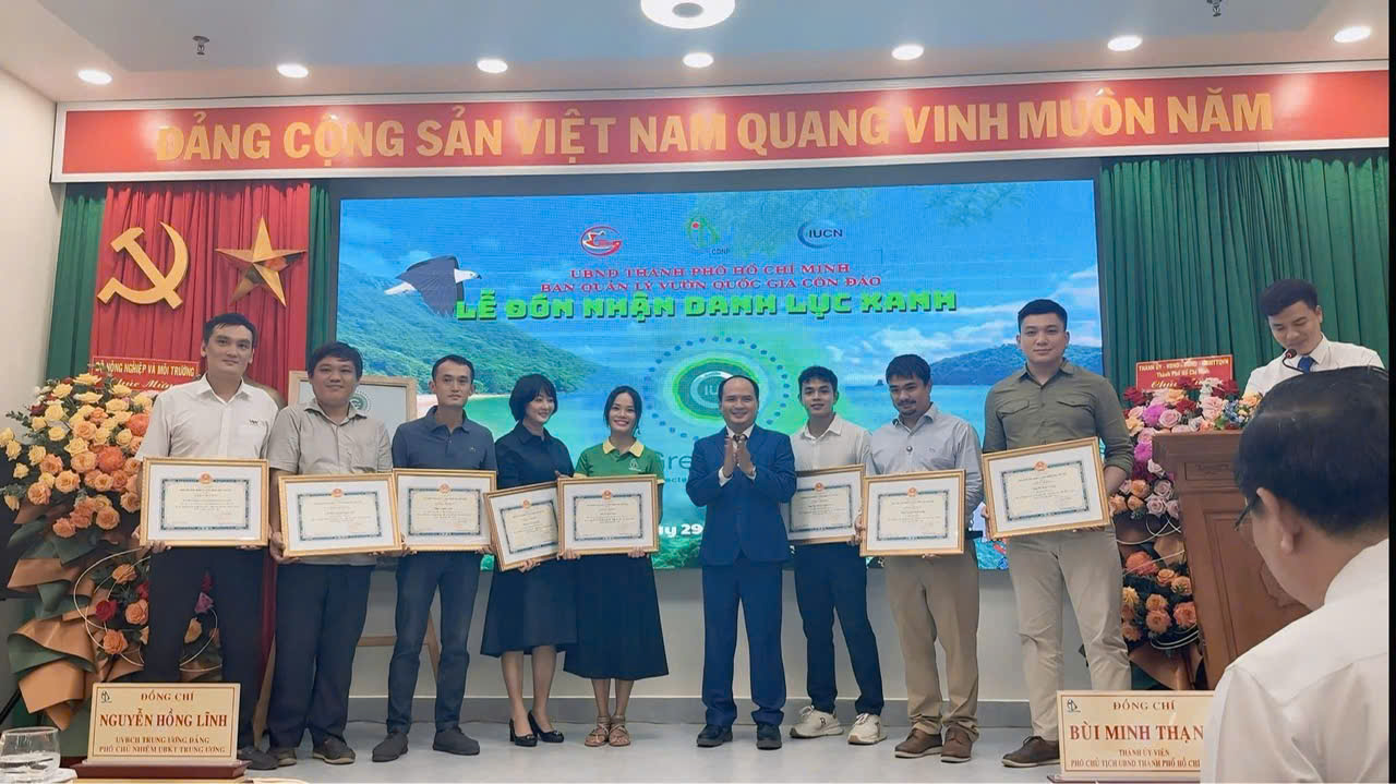 Hà Bảo Bình và các bạn trẻ nhận giấy khen của Vườn Quốc gia Côn Đảo tại lễ đón nhận danh lục xanh IUCN vào cuối tháng 11-2025. (Ảnh: BÙI PHAN THẢO và Facebook nhân vật).