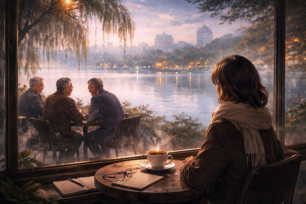 Cô gái cười nhẹ, lắc đầu: “Không có cô à. Ở đây chỉ có các loại thức uống trong menu cô đang cầm trên tay”. Hân quay nhìn ra mặt hồ. Hơi nước và làn sương vẫn bảng lảng sương khói mơ hồ. Giá như có được một ly cà phê pha phin và nhìn từng giọt, từng giọt cà phê rơi xuống đáy ly rồi thưởng thức tách cà phê bốc khói trước một không gian hoà quyện giữa đất trời, sóng gió, mây nước, bờ hồ, bóng cây và thời gian vẫn đang trôi.
