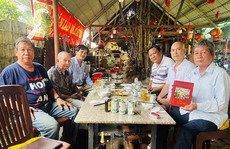 Nhà văn Cao Chiến (cầm sách) cùng các đồng nghiệp luận bàn về tập thơ “Lò mổ” của nhà thơ Nguyễn Quang Thiều