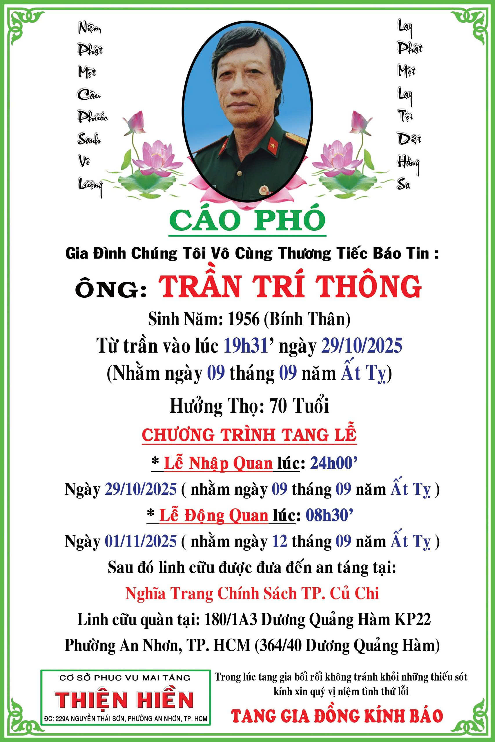 Nhà thơ TRẦN TRÍ THÔNG, hội viên Hội Nhà văn TP. Hồ Chí Minh, hội viên Hội Nhà văn Việt Nam, sau thời gian dài lâm trọng bệnh, đã từ trần lúc 19h30 ngày 29/10/2025 tại TP. Hồ Chí Minh, hưởng thọ 70 tuổi.